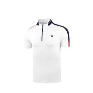 - Áo thiết kế cổ đứng ngắn chữ T, cổ và vai áo màu đối lập tạo điểm nhấn cho áo, trẻ trung hiện đại những vẫn giữ được sự nhã nhặn cho các Golfer trên sân.