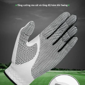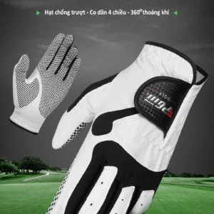 Tổng quan sản phẩm – Chống trượt, chống trượt, hạt thoáng khí- Vải siêu sợi của găng tay thể thao, mang lại cảm giác mềm mại và thoải mái, chống bụi bẩn và chống mài mòn.- Găng tay vải siêu sợi, giúp thấm hút mồ hôi cực mạnh. Giúp tăng ma sát, chơi ổn định hơn, đánh bóng xa hơn, và bảo vệ tốt lòng bàn tay của bạn.- Các hạt chống trượt của lòng bàn tay làm tăng ma sát và tăng cảm giác cầm nắm. Lỗ thoáng khí + Vải microfiber ở mặt sau của ngón tay được thiết kế với các lỗ thông hơi để thoát mồ hôi tối đa.- Việc cầm gậy golf và Swing mạnh rất dễ tuột tay, hoặc gây chấn thương, bong gân, bong da tay. Vì thế buộc phải đeo găng tay bảo vệ và giúp đánh bóng chắc chắn, chuẩn xác.
